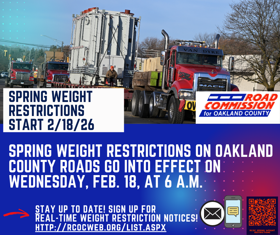 The Road Commission for Oakland County (RCOC) will apply seasonal spring weight restrictions to its non-all-weather roads on Wednesday, Feb. 18, at 6 a.m. The restrictions limit the weight trucks can carry on roads and are intended to minimize damage to roads while the ground beneath them thaws.