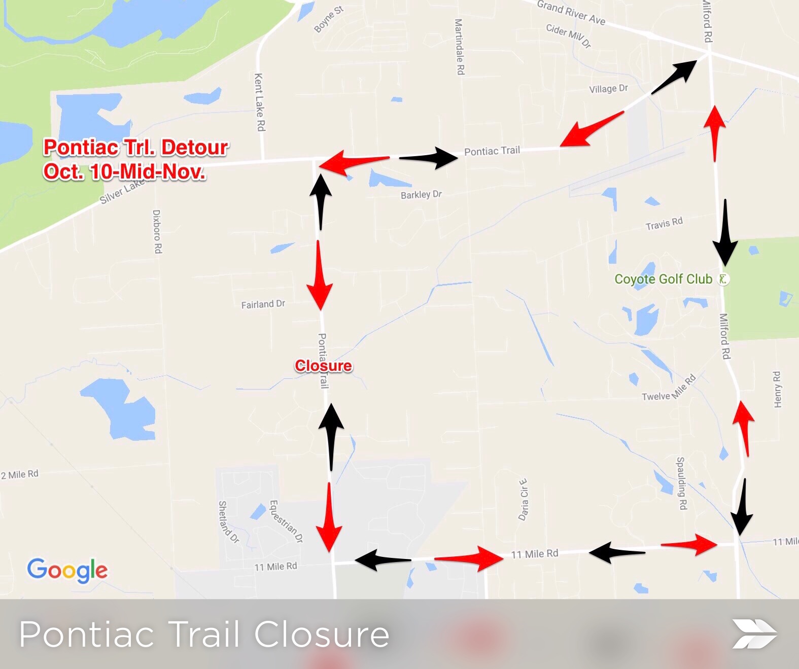 The detour for the closure is 11 Mile Road to Milford Road back to Pontiac Trail and vice versa.